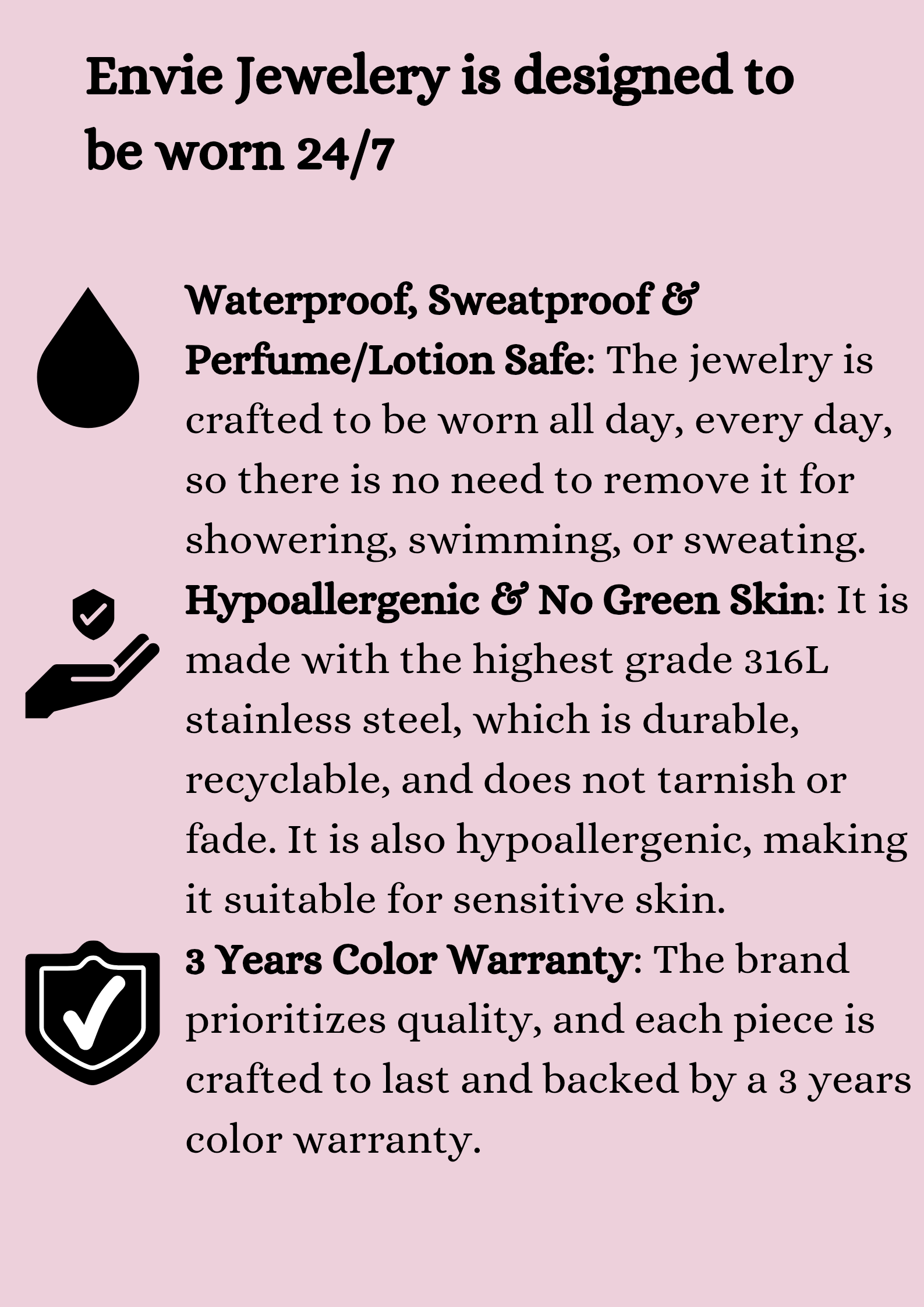 Envie jewelry is waterproof, tarnish-free and hypoallergenic.